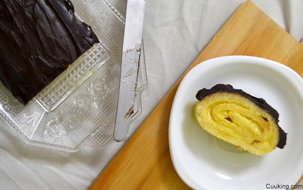 7.- Colocamos el rollo de crema sobre el plato o bandeja donde lo vayamos a servir y cubrimos con ganache templada.