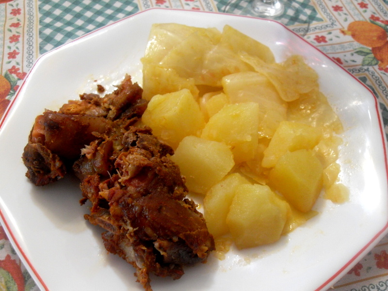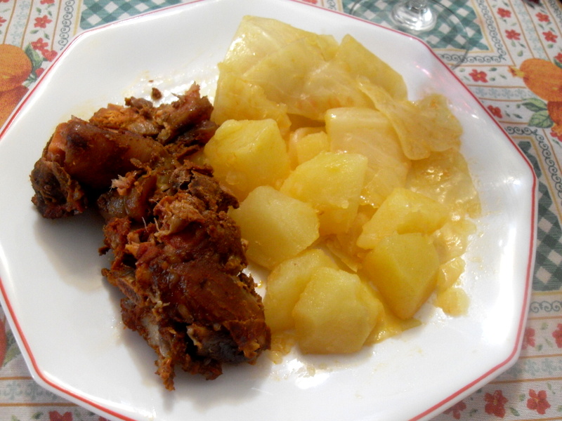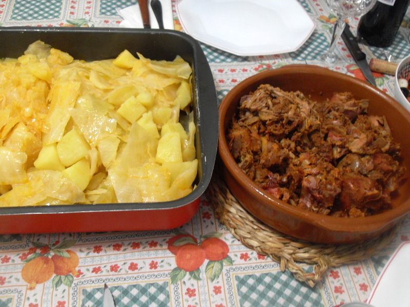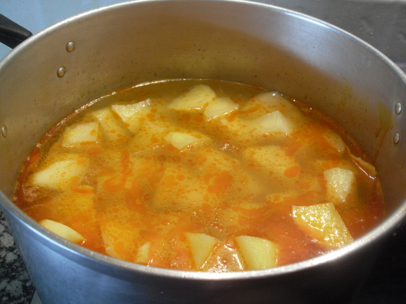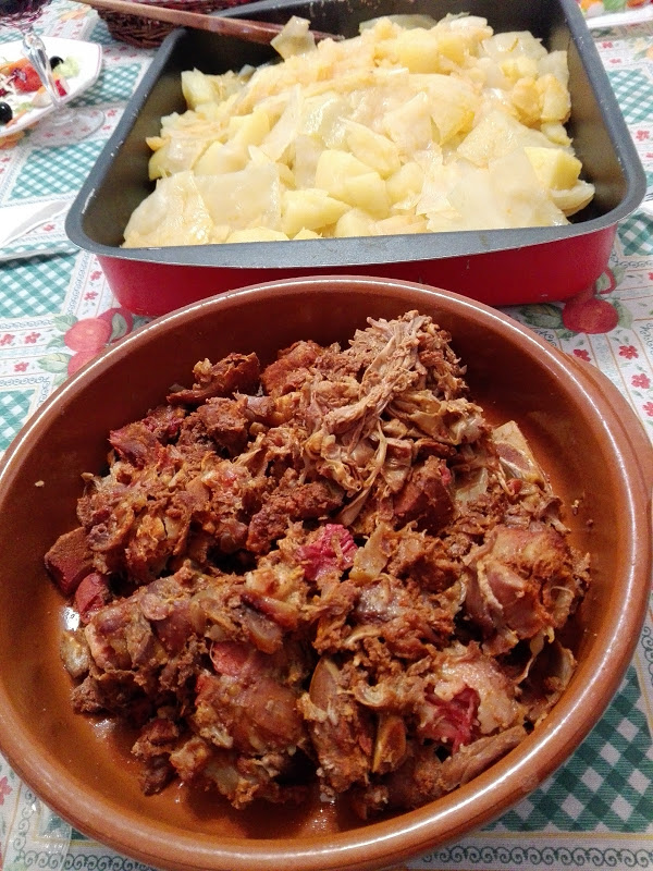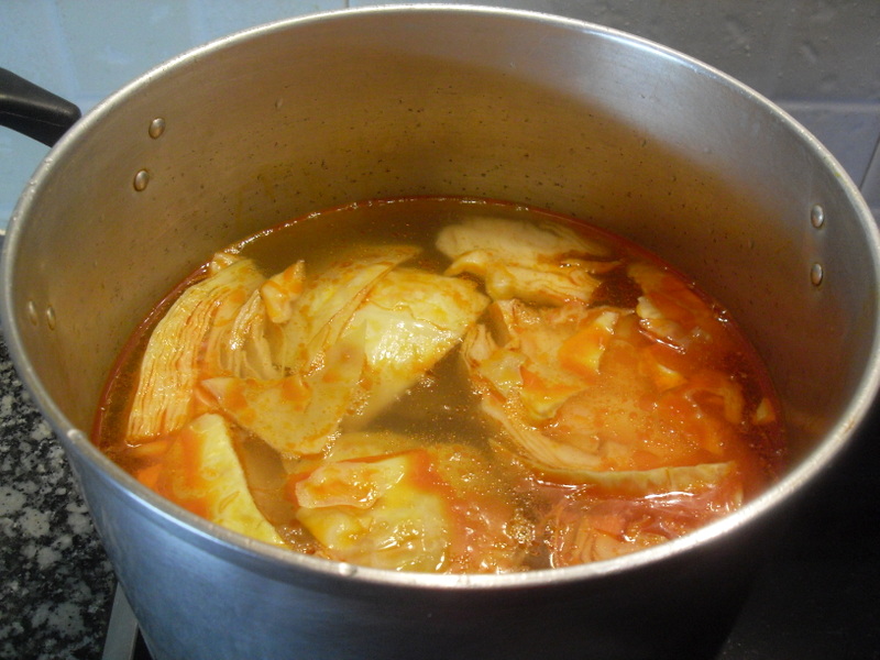A los 45 minutos que falten de finalizar la cocción del botillo, agregar la col troceada y a los 30 añadir las patatas. Toda la verdura se cocinara con el sabor y el color del pimentón que desprende el botillo.