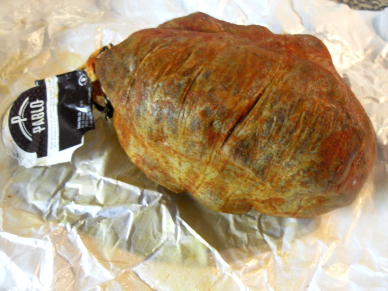 Y como describe la Wikipedia "El botillo de El Bierzo es un producto cárnico elaborado con diferentes piezas procedentes del despiece del cerdo (costilla, rabo y huesos poco descarnados), troceadas, adobadas con sal, pimentón y ajo y otras especias naturales, embutido en el ciego del cerdo, ahumado y semicurado. También podemos añadir lengua, paleta, carrillera y espinazo siempre que no sobrepase el 20%."