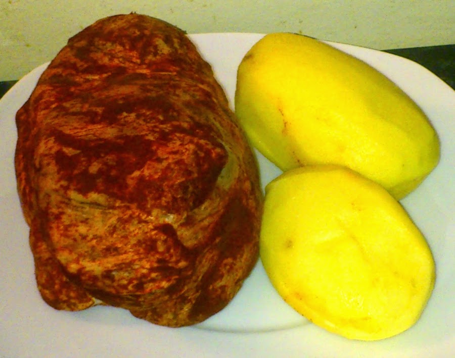 Una vez cocidas las patatas, se cortan y en una fuente se mezclan con el botillo abierto.