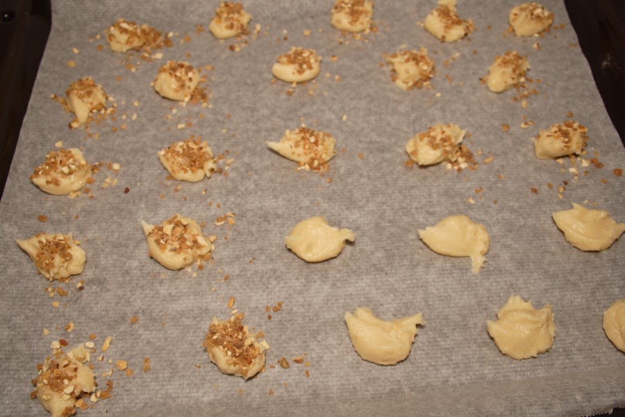 Vamos dejando "los botones" de masa sobre la bandeja de horno forrada, un poco separados porque en el horno se extienden y espolvoreamos con la almendra en grano.