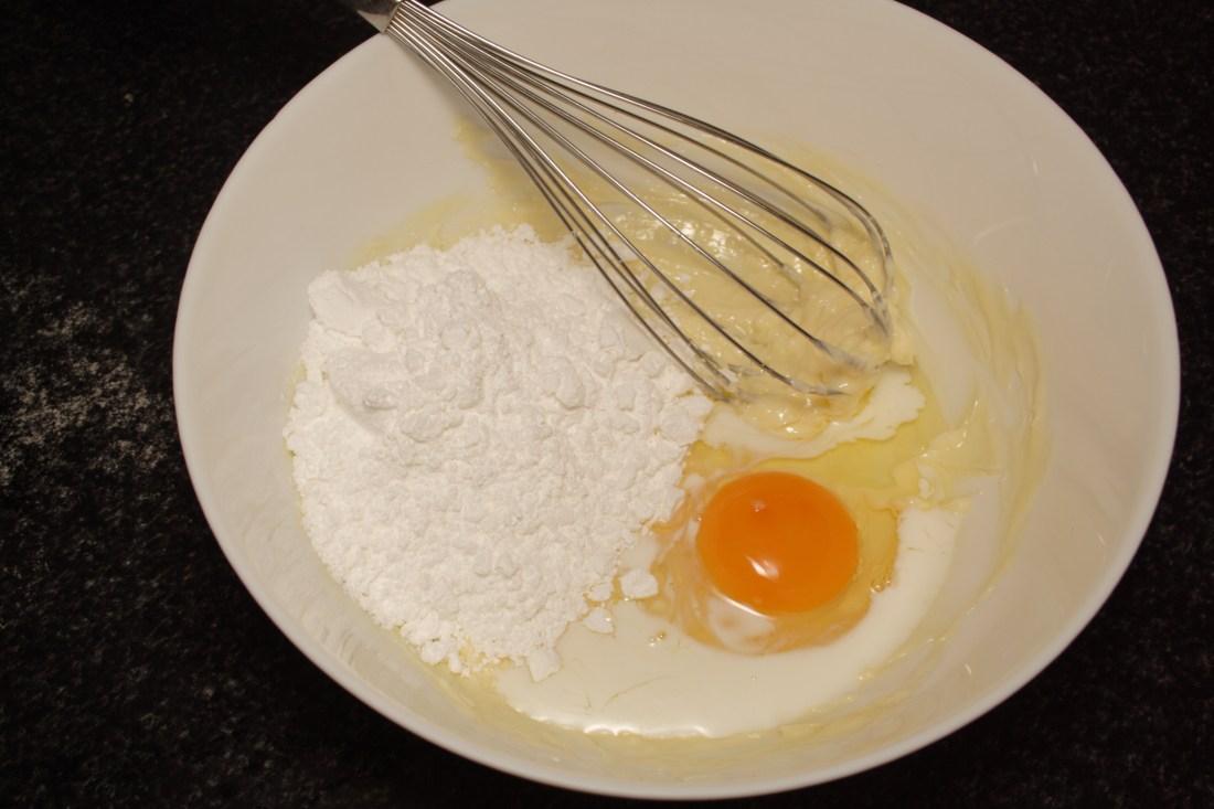 Incorporamos el azúcar, la leche y el huevo. Mezclamos bien con una varilla manual, que queden perfectamente integrados, con un aspecto de crema.