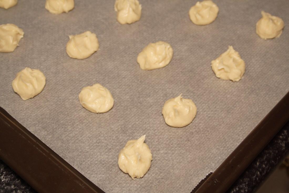 Ahora con una cucharilla o con ayuda de una manga pastelera de boquilla redonda lisa, colocamos nuestros “botones” sobre la bandeja forrada, dejando separación entre ellos porque se extienden un poco.