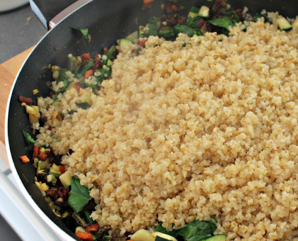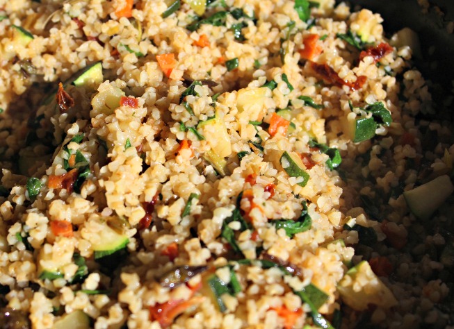 Añadimos el boulgour a las verduras y también un poco del caldo reservado.