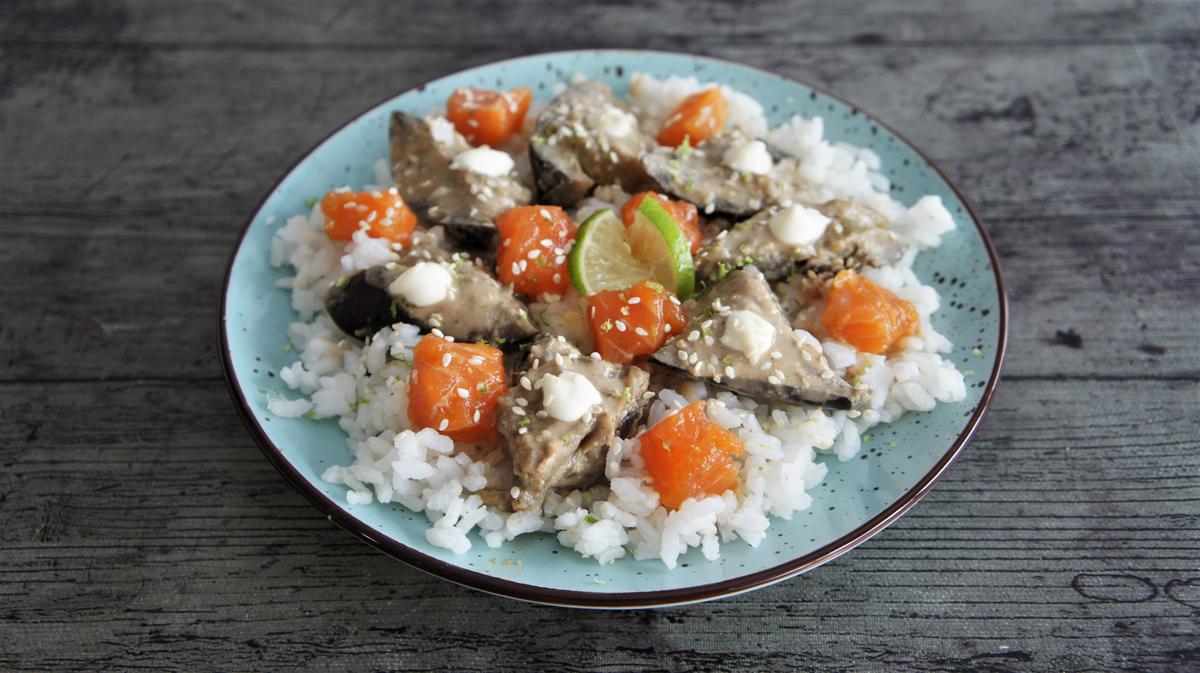 Servimos el arroz cocido con la berenjena y el tartar de salmón. Decoramos con unas semillas de sésamos y unos pegotitos de mayonesa.