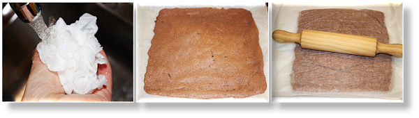 Moja una hoja de papel vegetal y escurre muy bien. Extiende sobre la mesa de trabajo. Reserva.