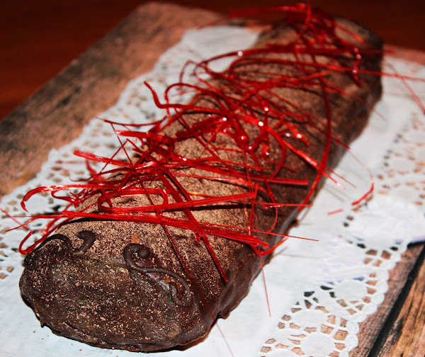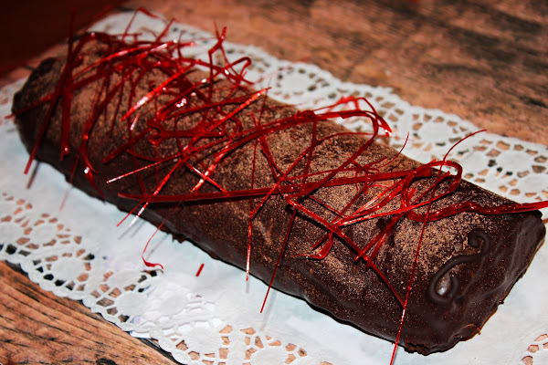 Quise bañarlo de chocolate y darle un toque diferente con unas virutas de caramelo que te diré que fue lo que me resultó más laborioso porque empecé a hacer virutas y aquello no había por donde cogerlo..., hilos de caramelo y caramelo por toda la cocina ¡jajaja!. Mereció la pena el resultado, a mí me gustó.