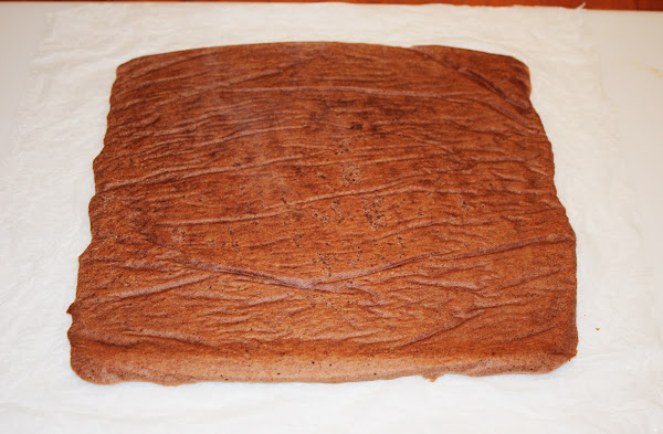 Una vez hecho el bizcocho, extiende RÁPIDAMENTE la superficie sobre la hoja de papel vegetal que tenías escurrida y sobre la superficie de trabajo. En la 3ª imagen se aprecia el bizcocho con la hoja de papel en la que se horneó, la mojada está debajo, sobre la mesa.