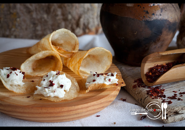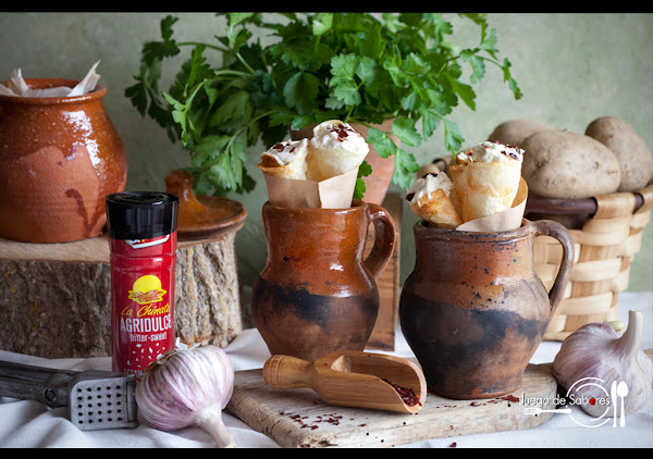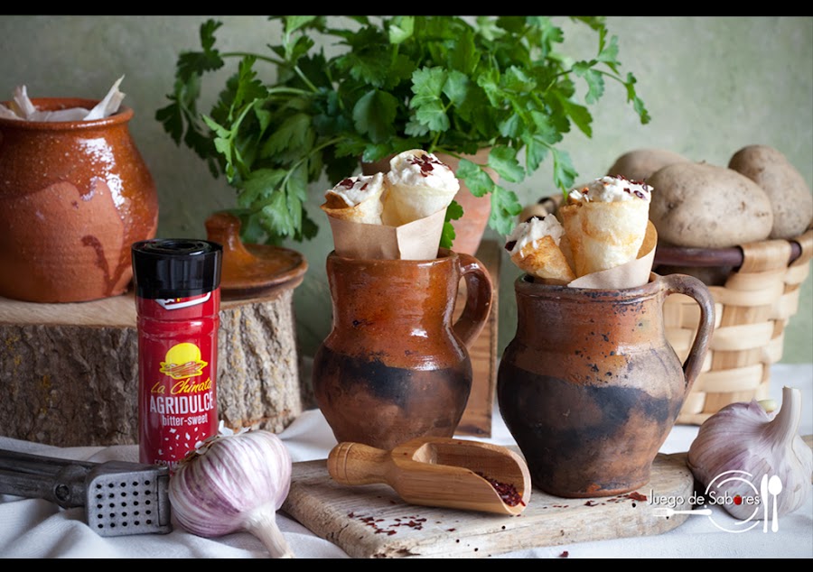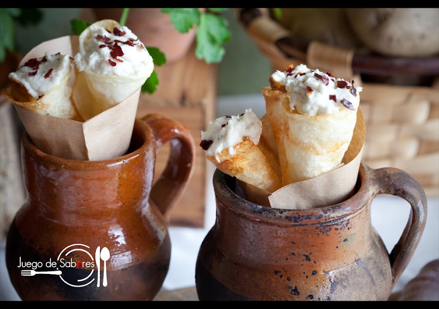 En su día hicimos unos Pimientos del piquillo rellenos de brandada de bacalao, pero hoy hemos querido complicarnos la vida y presentamos la brandada dentro de unos cucuruchos de patatas fritas coronados de escamas de pimentón de La Chinata. Es un aperitivo distinto.