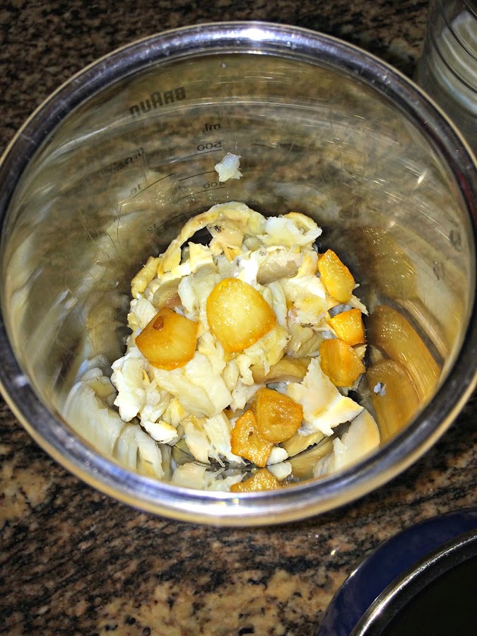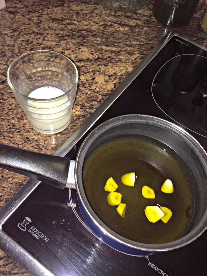 En mi caso usé dos dientes de ajo para que no saliera muy fuerte, va al gusto de cada uno, probar y si lo queréis más fuerte añadir más ajo.
