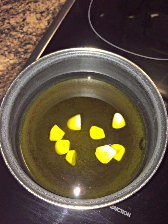 Lo sacamos del agua y lo dejamos enfriar. Reservar el agua de la cocción. Mientras vamos a trocear el ajo y lo ponemos con el aceite al fuego. Lo dejaremos cocinar a fuego suave unos 6-8 minutos, para que el aceite infusione y el ajo no quede crudo, pero que tampoco se queme.
