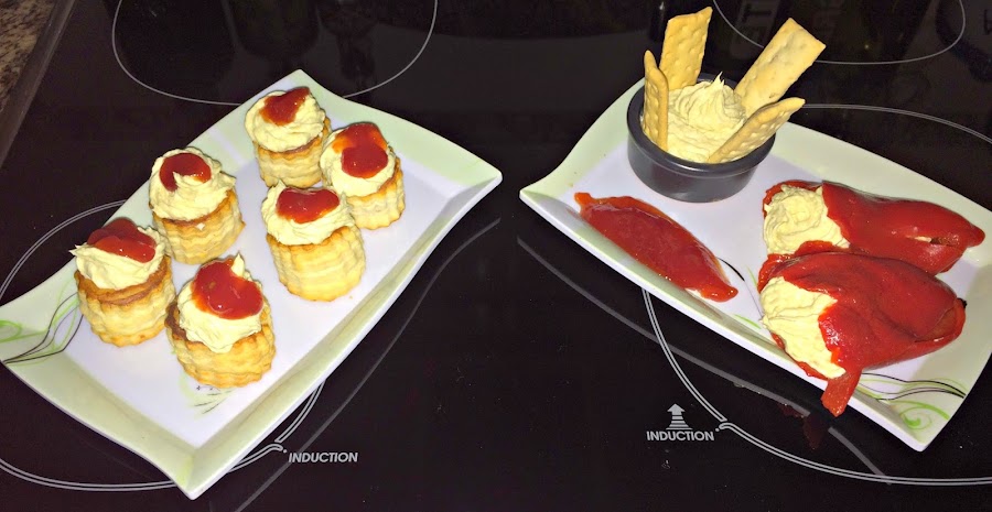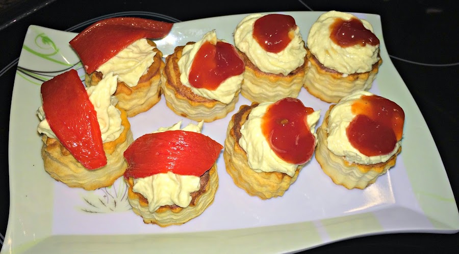 Volovanes rellenos de brandada de bacalao, bien cubiertos de un trocito de pimiento o de mermelada de tomate.