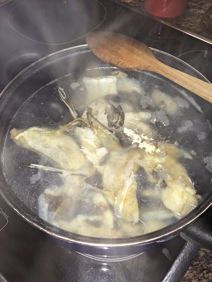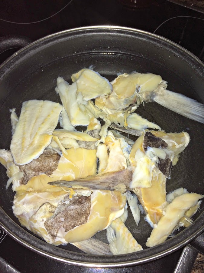 Una vez tengamos el bacalao desalado, lo vamos a poner al fuego en una cacerola, cubierto de agua. Justo antes de que empiece a hervir lo retiramos del fuego, lo que buscamos es poder despegar la carne del bacalao de las espinas, no que se cocine.