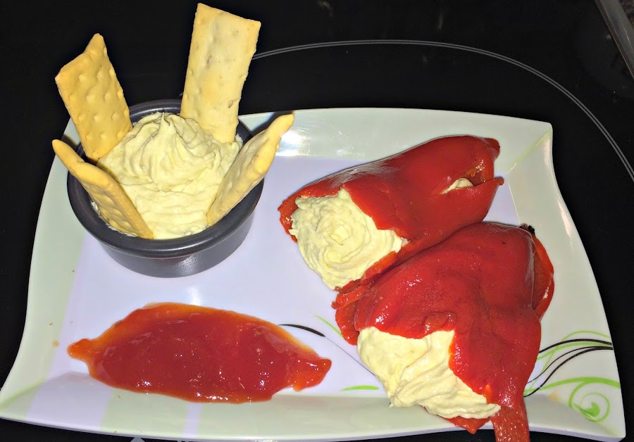 Pimientos del piquillo rellenos de brandada, acompañados de mermelada de tomate.