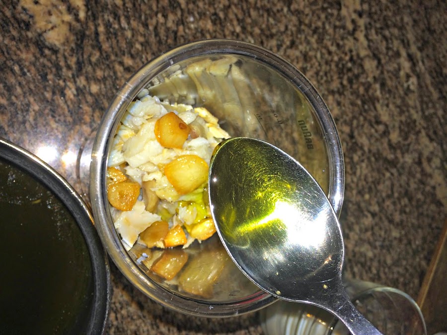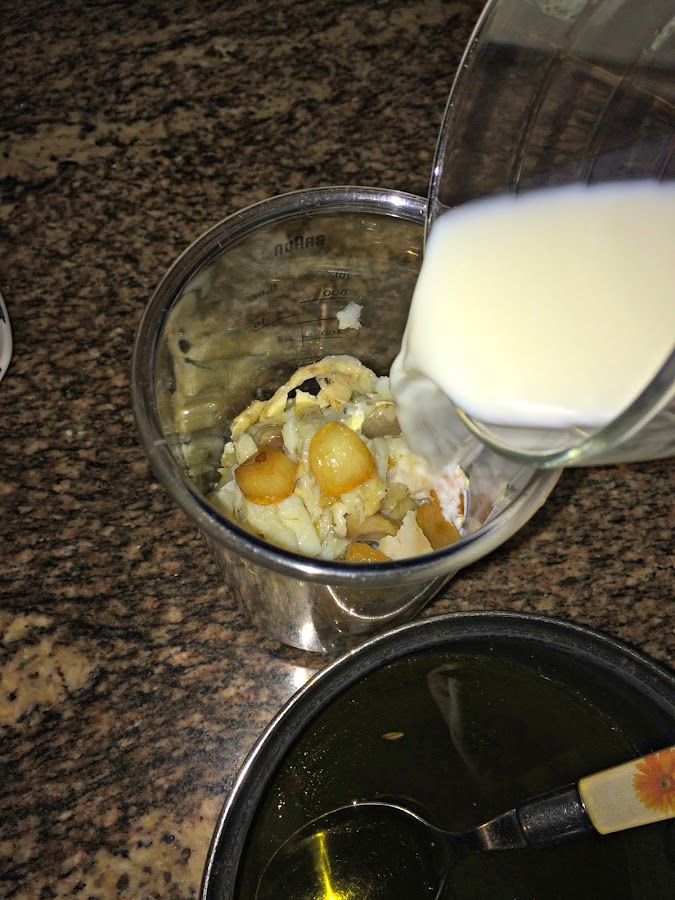 Mientras se cocina el ajo, vamos desmigando el bacalao y lo ponemos en el vaso de la batidora, junto con la leche, que habremos templado en el microondas. Añadimos el ajo y un par de cucharadas de aceite, al vaso de la batidora, y la cayena molida al gusto.