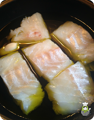 En una sartén con abundante aceite de oliva y un diente de ajo (entero o en rodajas), confitamos los trozos de lomo de bacalao desalado y sin piel a fuego muy bajo durante cinco minutos. Retiramos los trozos de bacalao y reservamos el aceite. En un cazo, cocemos la patata y mientras tanto desmigamos el bacalao.