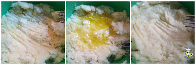 En un bol, deshacemos la patata con ayuda de un tenedor, como cuando queremos preparar puré. Luego le añadimos la miga de bacalao y batimos bien todo hasta obtener una mezcla homogénea.