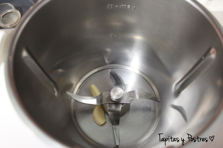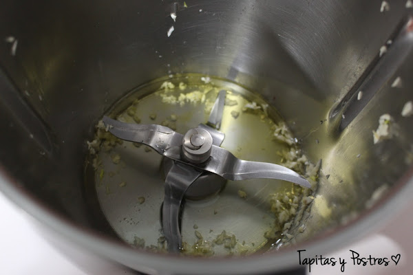 Ponemos en el vaso de la thermomix los ajos y picamos cinco segundos a velocidad siete. Bajamos los restos hacia abajo y añadimos el aceite y calentamos 6 minutos, temperatura varoma y velocidad cuchara. Sacamos este aceite del vaso y lo reservamos.