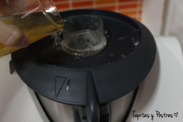 Y con la maquina en marcha añadimos el aceite poco a poco para que emulsione.Si veis que os quedó muy liquida, volvemos a cocinar unos minutos mas.