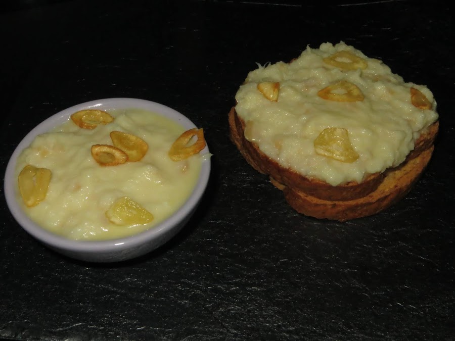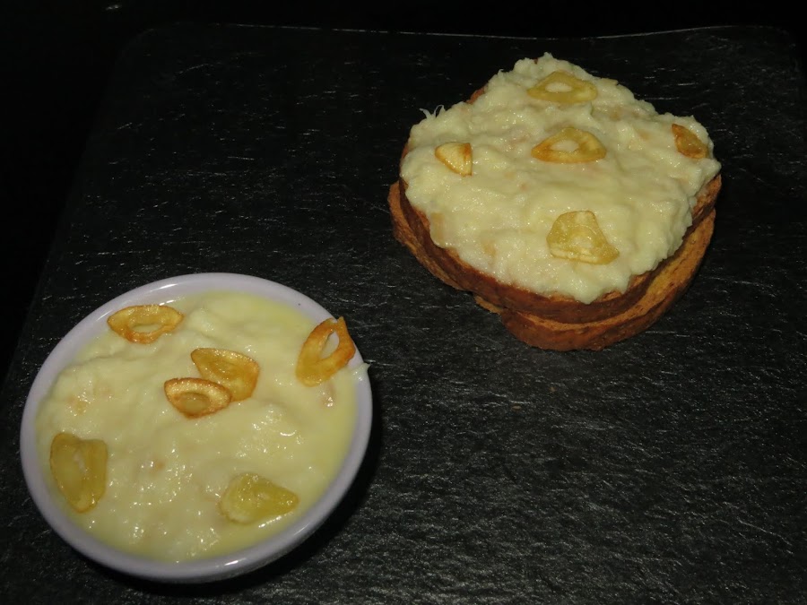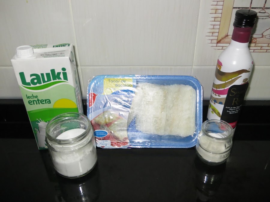En un cazo a fuego bajo echamos el bacalao desmigado y vamos añadiendo una cucharada de aceite y cuando y la haya absorbido añadimos una leche así sucesivamente hasta que tenga la textura deseada. Finalmente añadimos un poco de azúcar y sal si hace falta y emplatamos con las láminas de ajo y colocamos al lado rebanadas de pan para untar. También podemos decorar con un poco de perejil fresco.