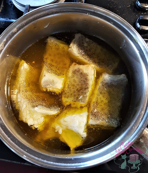 En ese aceite pondremos el bacalao y lo dejamos confitar unos 10 minutos, a fuego muy, muy lento, sacamos a un plato y reservamos el aceite.