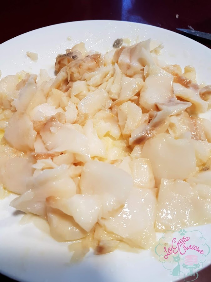 Cuando el bacalao esté tibio podemos limpiar completamente y desmigar, quitamos piel y las espinas que queden.