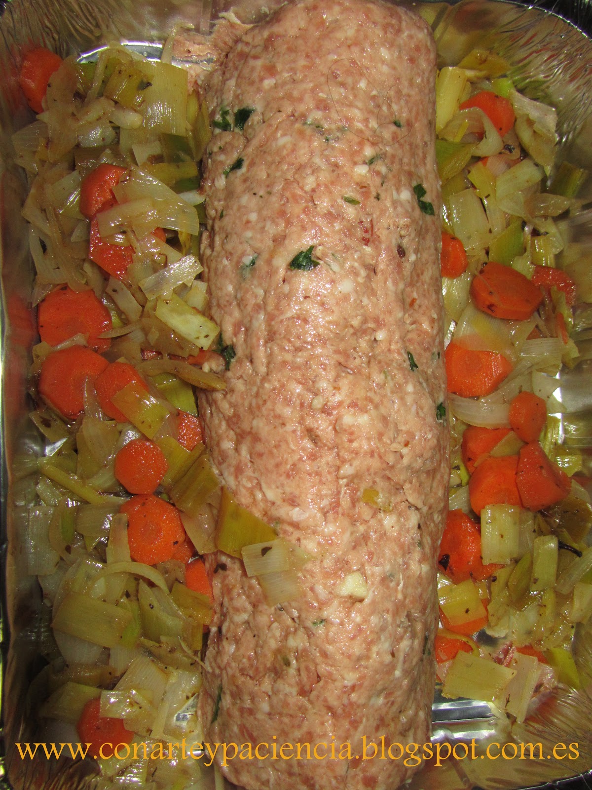 Colocamos el rulo sobre la recipiente, añadimos la verdura y el jugo de los pimientos asados.Lo introducimos en el horno a 150 º una hora y media. En el transcurso de su horneo echamos un vaso y medio como mínimo de vino blanco.