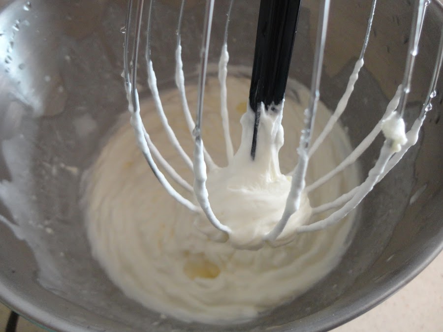 Mientras enfría el bizcocho montaremos la crema. Ponemos en un bol el queso, la nata (crema de leche) y el azúcar, y batimos bien hasta que la nata (crema de leche) haya montado y la crema esté uniforme (todos los ingredientes tienen que estar muy fríos).