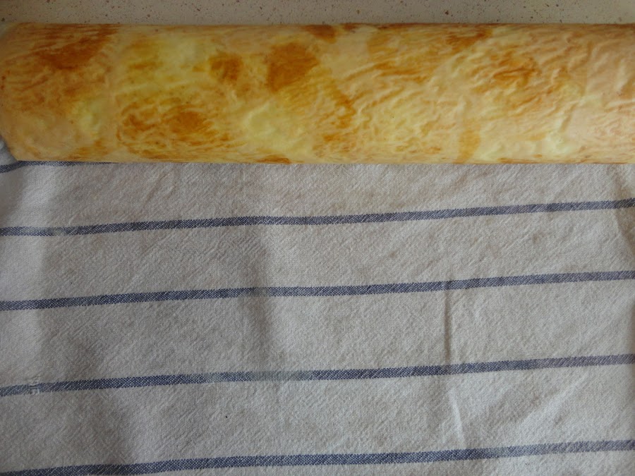 Una vez lista la plancha de bizcocho, la sacamos del horno y, en caliente, colocamos un paño limpio y enrollamos en la dirección que vayamos a hacer el brazo, y dejamos enfriar.