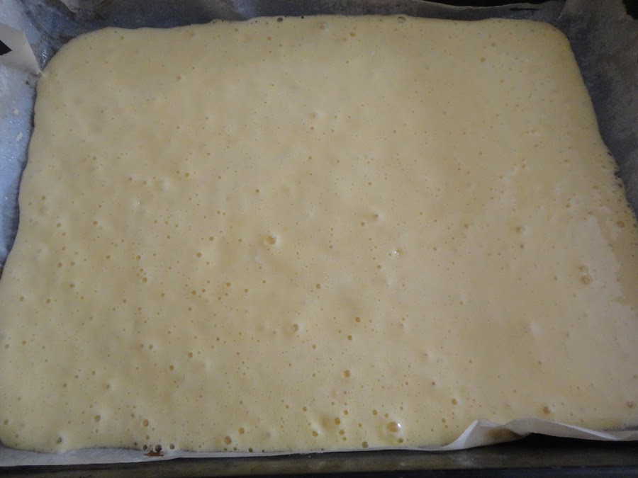 Una vez tengamos una crema homogénea, vertemos en una bandeja de horno cubierta con papel de hornear, y extendemos de forma uniforme. Horneamos unos 20 minutos a 180°C.