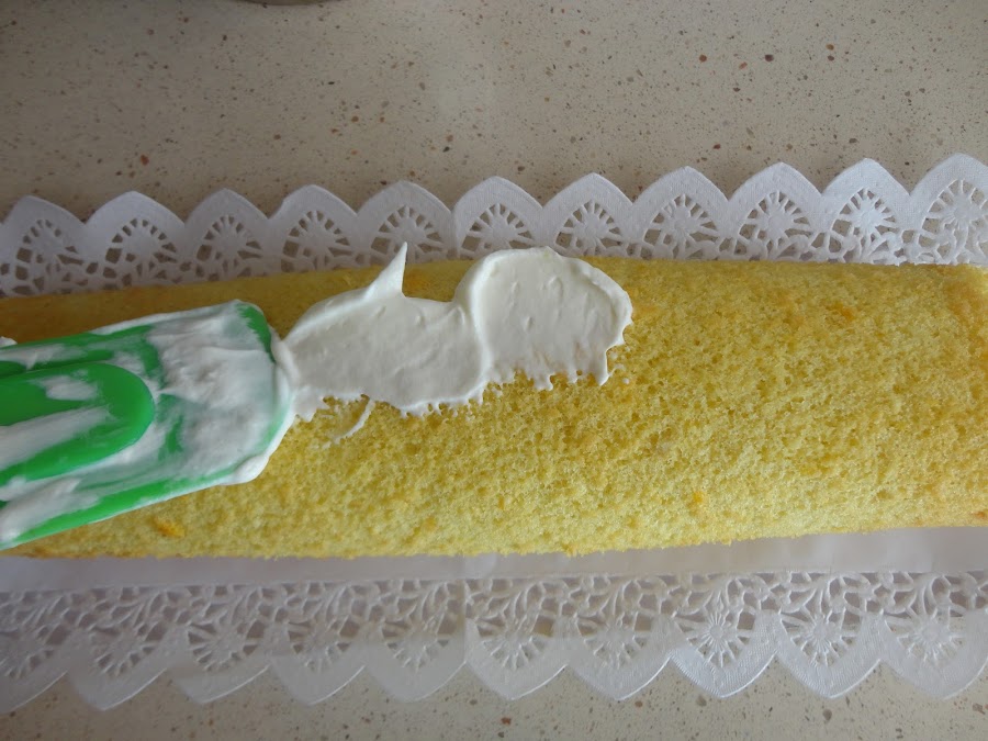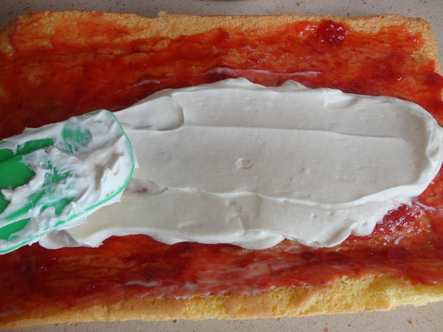 Para montar el pastel, retiramos el paño del bizcocho y el papel de hornear también, con cuidado. Extendemos la mermelada por toda la superficie y la crema de queso, dejando un centímetro sin relleno, ya que al enrollar de nuevo la crema se puede desbordar.