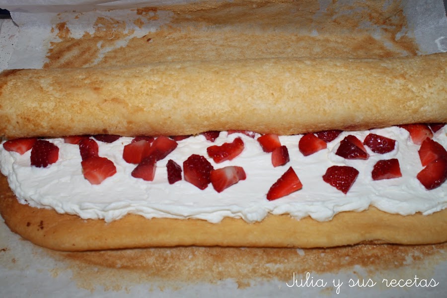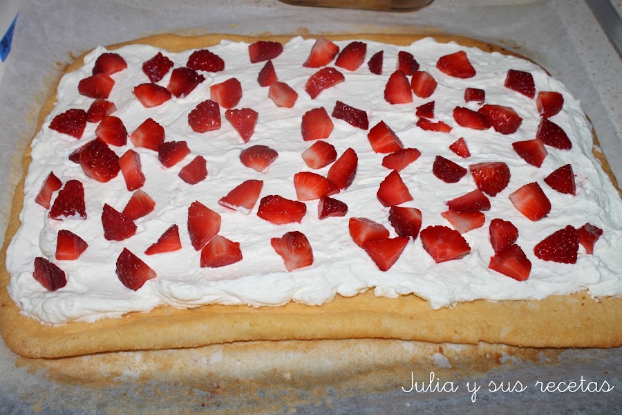 La mitad de la nata (crema de leche) la ponemos para rellenar el brazo y la extendemos encima del bizcocho, ponemos las fresas cortadas encima de la nata (crema de leche).
