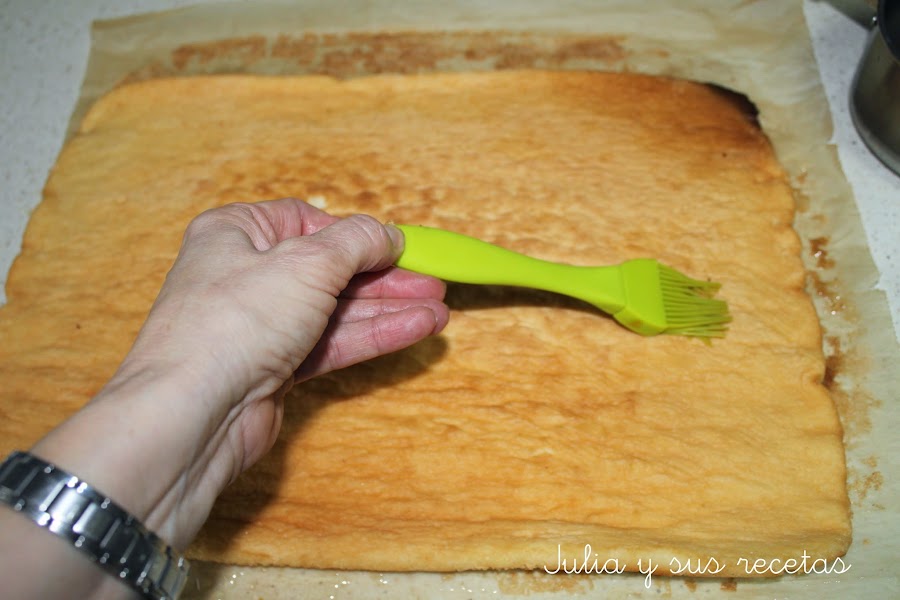 Desenrollamos el bizcocho y lo humedecemos con el almíbar.