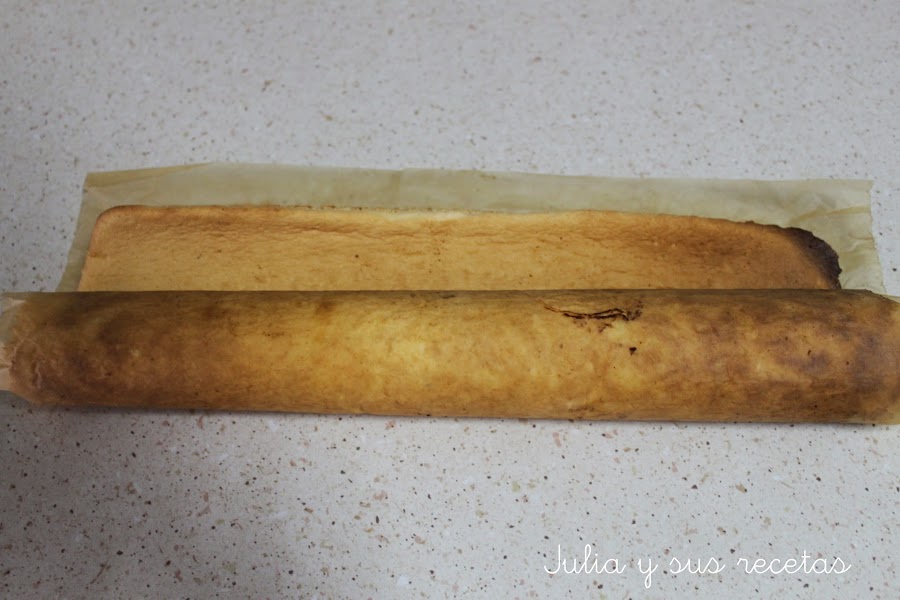 Lo enrollamos aún caliente con el mismo papel de hornearlo.