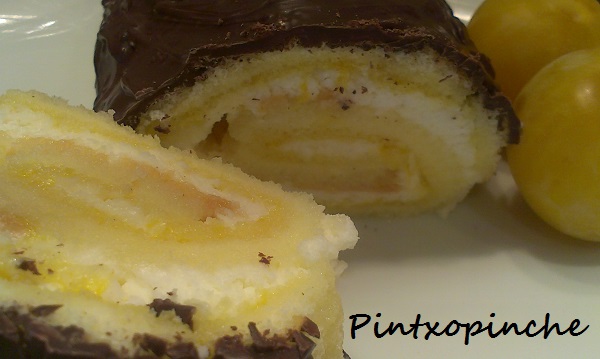 Por casa habían comprado foskitos, porque los demás pueden comerlos, yo todavía tengo en mente a que saben los foskitos, qué ricos y, claro, pues aunque una intenta reprimirse las ganas, también me gustan los foskitos y diréis que tienen que ver los foskitos con las ciruelas, pues me hice un brazo de gitano con una compota de ciruelas, nata (crema de leche) y chocolate, que apaciguo totalmente mi deseo de foskitos, (aunque me quedo con ganas de hacer un par de ellos más) quedaron solamente las miguitas, porque los demás también atacaron al brazo de gitano aunque fuera sin gluten.