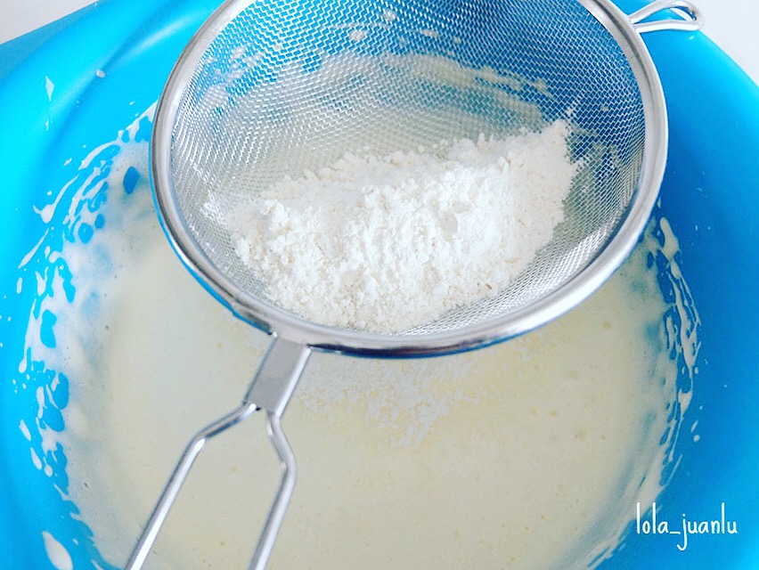 Tamizamos la harina sobre la mezcla anterior, poco a poco, y vamos a ir integrándola con movimientos envolventes con la ayuda de una lengua, hasta que quede una masa homogénea, aireada y sin grumos.