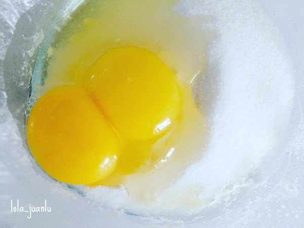 A continuación, en un bol introducimos los huevos y el azúcar y batimos con unas varillas hasta que se cree una espuma densa o doble su tamaño.