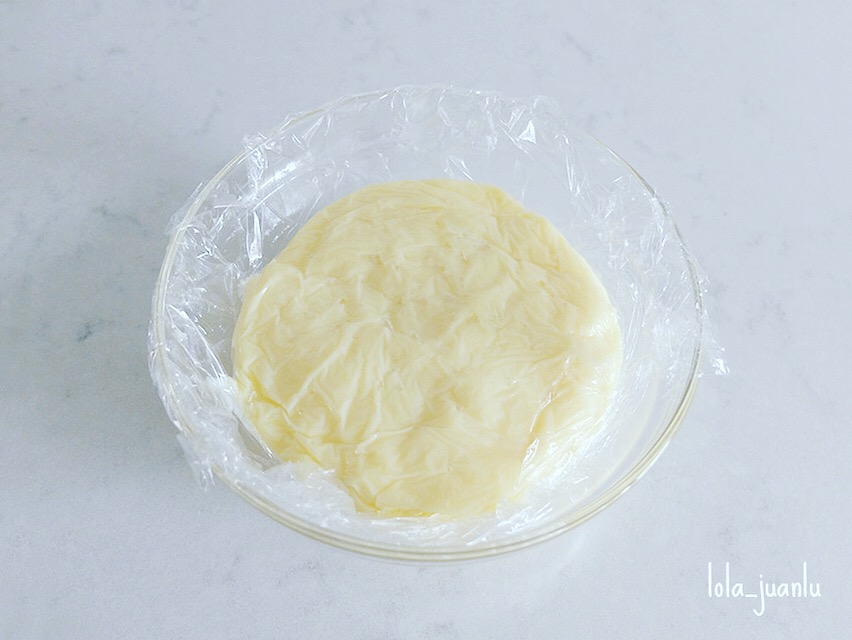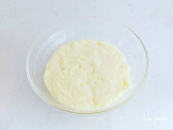 Se pasa a un bol, cubrimos a piel con papel film y dejamos enfriar. El papel film colocado sobre la crema hará que no se forme costra sobre ésta.