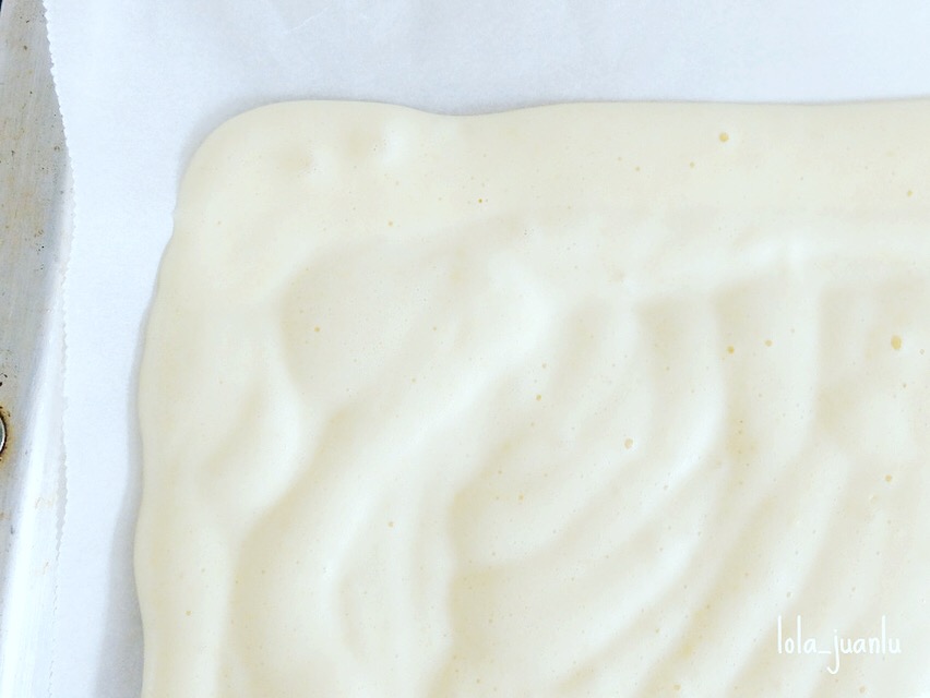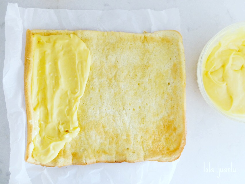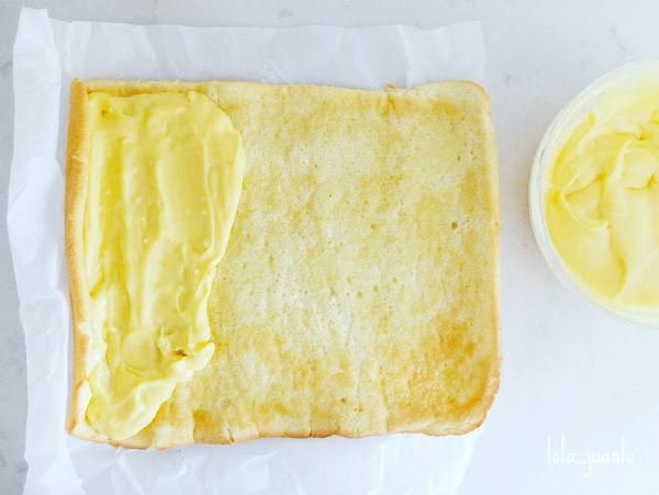 A continuación lo cubrimos con una capa de crema de mango, dejando una parte sin rellenar para que a la hora de enrollar, la crema no se salga.