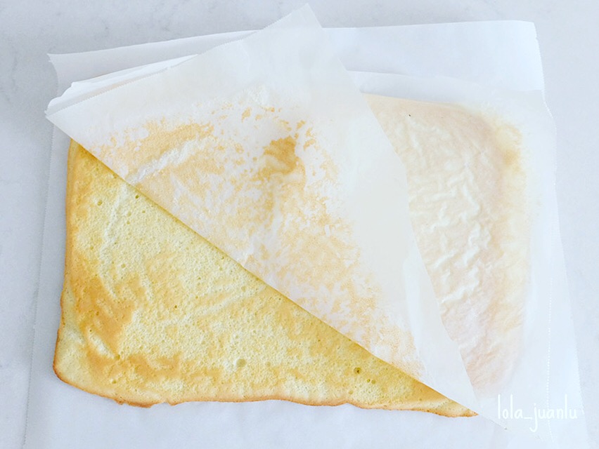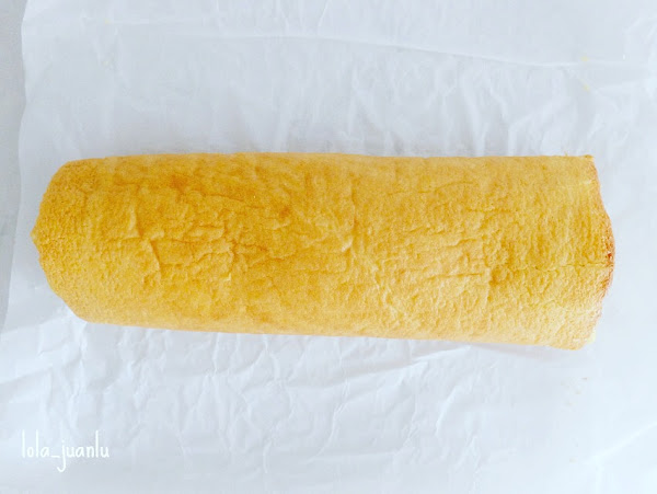 Enrollamos el bizcocho, colocamos la abertura hacia abajo, y cortamos los extremos para igualarlo.
