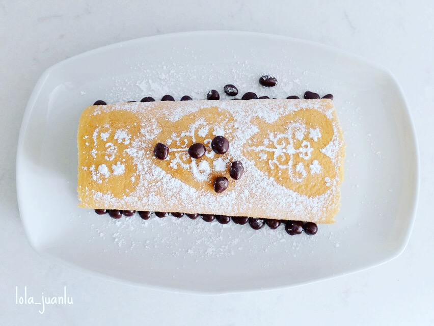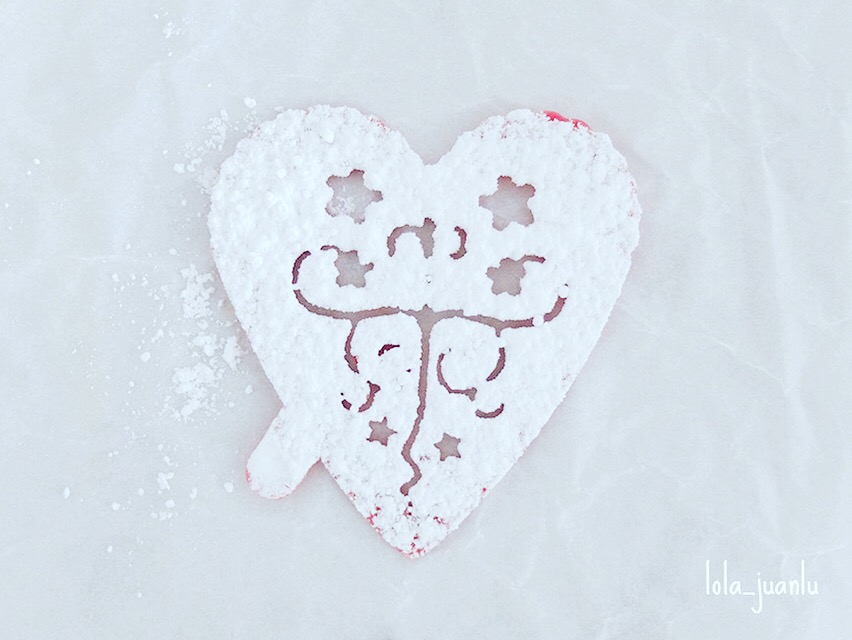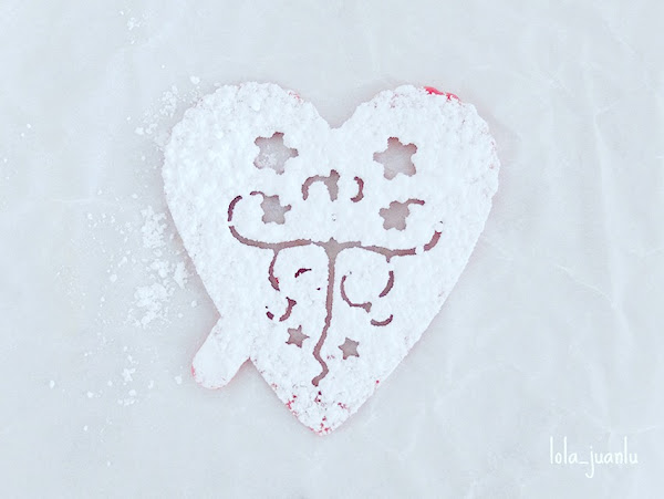 Lo colocamos en una fuente y decoramos. Yo tengo unas plantillas de corazones con dibujos que me gusta el efecto que queda cuando se espolvorea el azúcar glas sobre ellos.