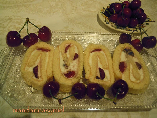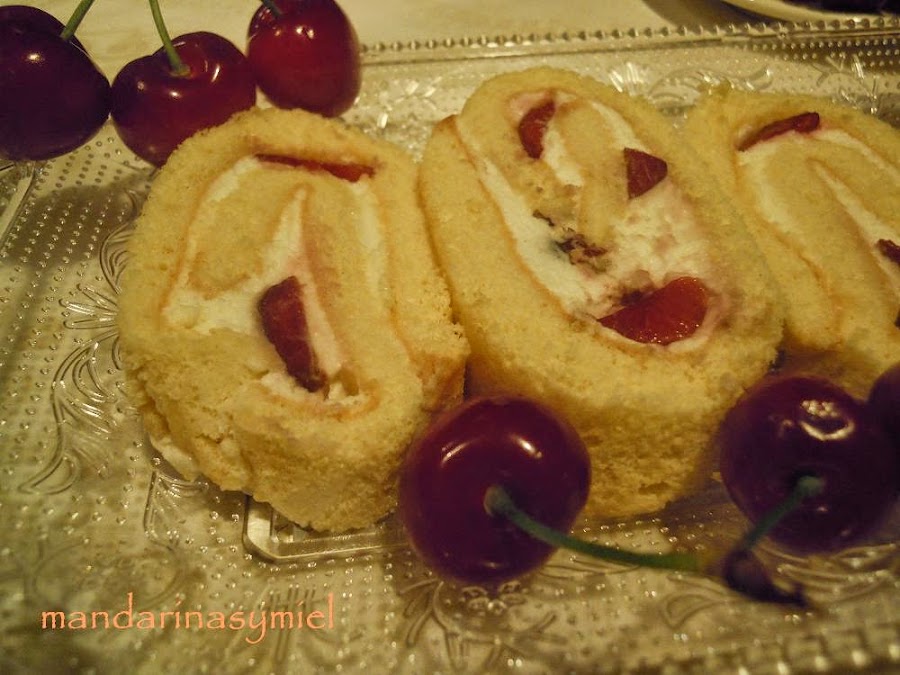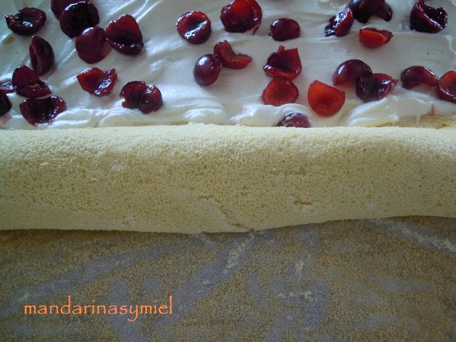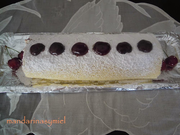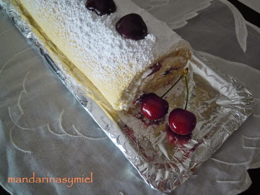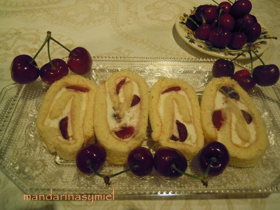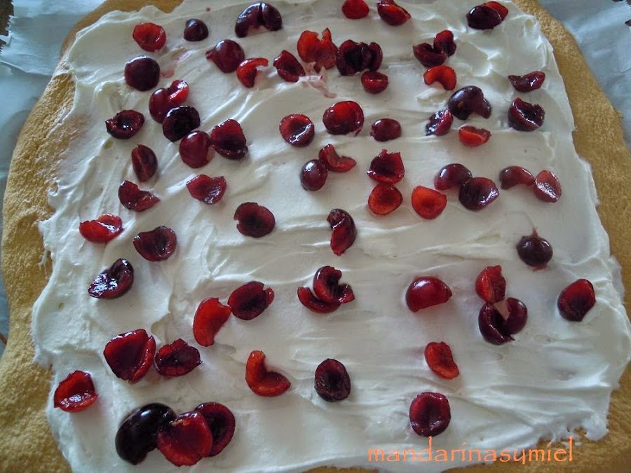 Estamos en época de cerezas y a parte de tomarlas frescas, que son una delicia, podemos probarlas de otras maneras, en este caso he hecho un brazo de gitano con nata (crema de leche) y cerezas.