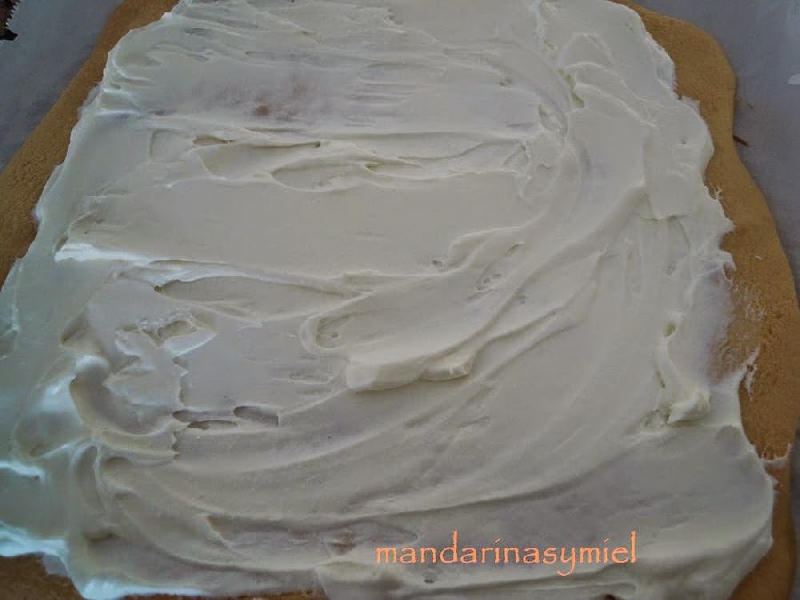 Enrolla con cuidado de que no se salga la nata (crema de leche). Cuando esté enrollado, tápalo con papel film y guarda en la nevera unas 3 horas.
