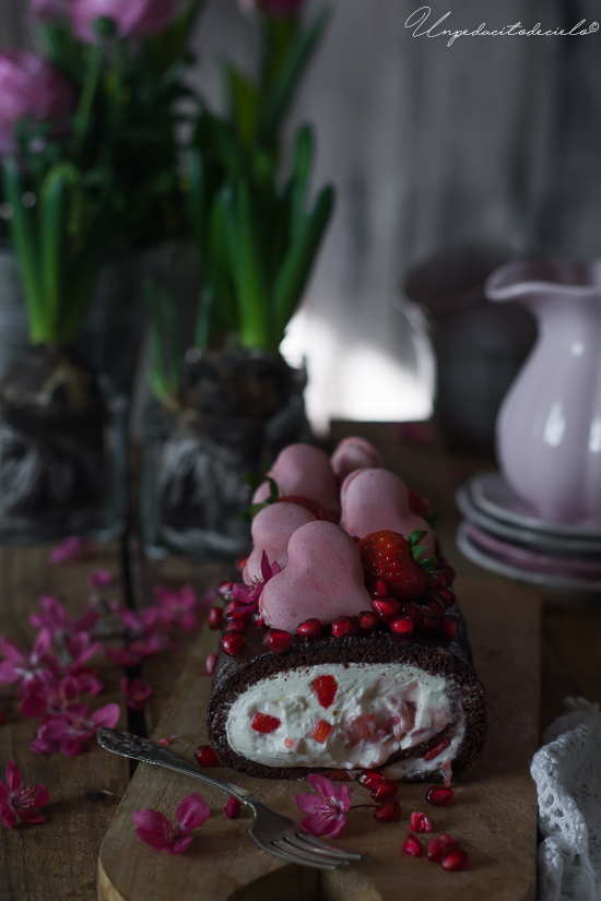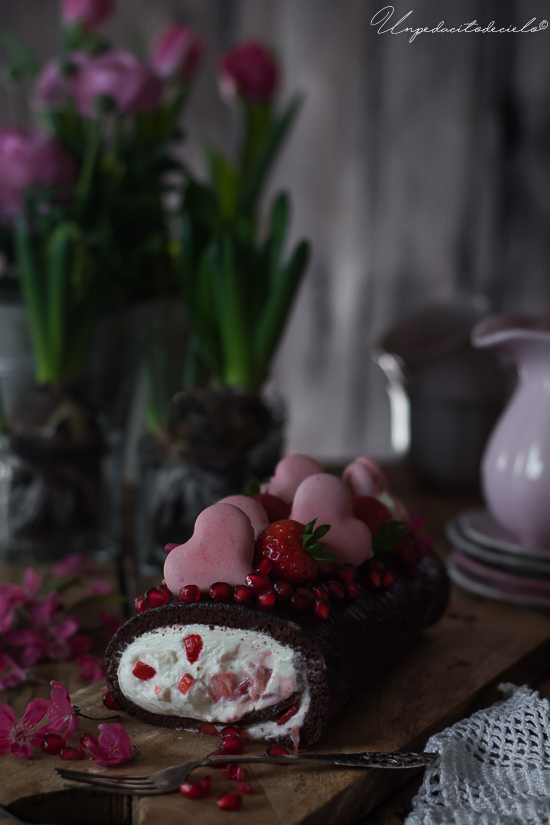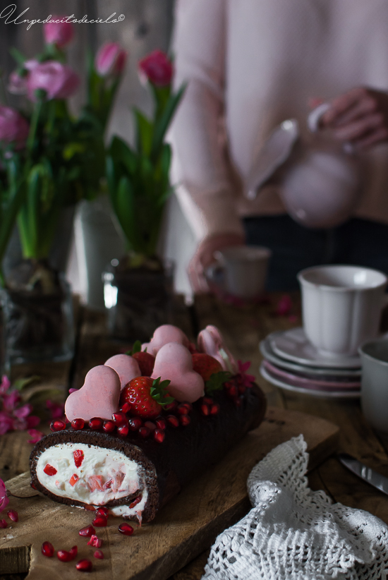 Pero os digo que este brazo de gitano de chocolate con fresas y relleno de mermelada de fresas con crema de queso y nata (crema de leche) y trocitos de fresas y más mermelada es ¡para perder el sentío!
