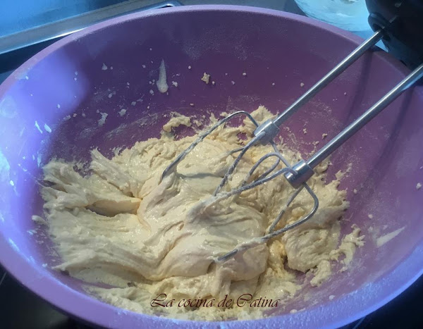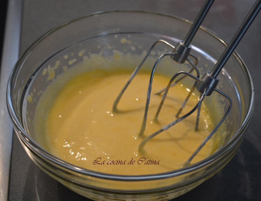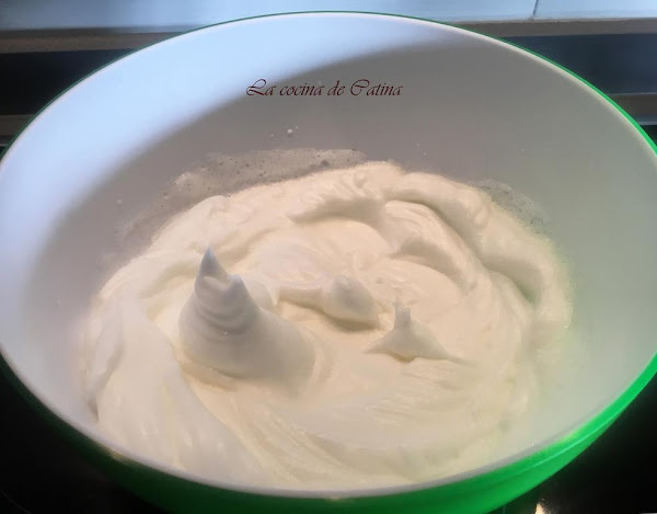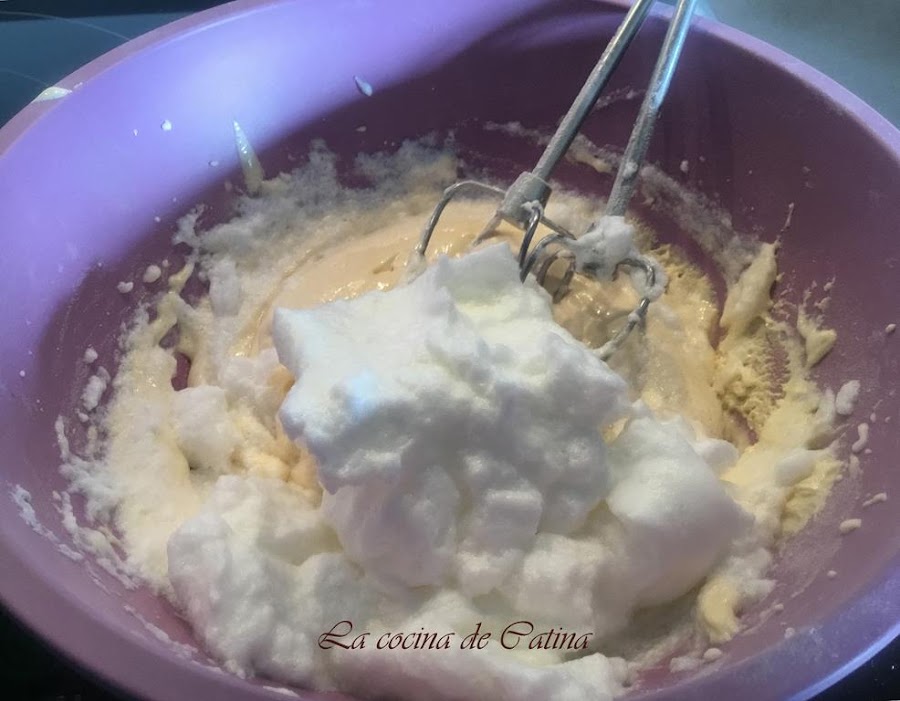 Batimos las claras a punto de nieve en otro recipiente, con una pizca de sal. Las incorporamos a la otra mezcla poco a poco.