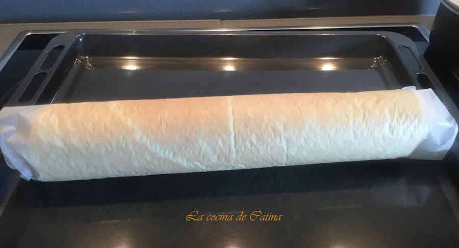 Horneamos durante 12 minutos. Sacamos el bizcocho de la bandeja y con el mismo papel de horno formamos un rulo y lo dejamos enfriar para que vaya tomando forma.