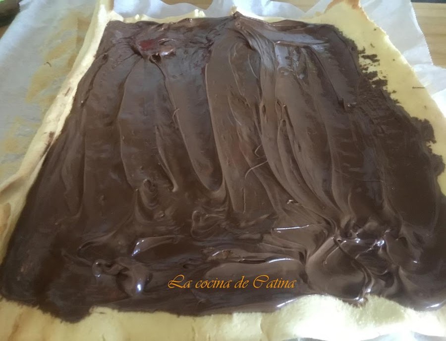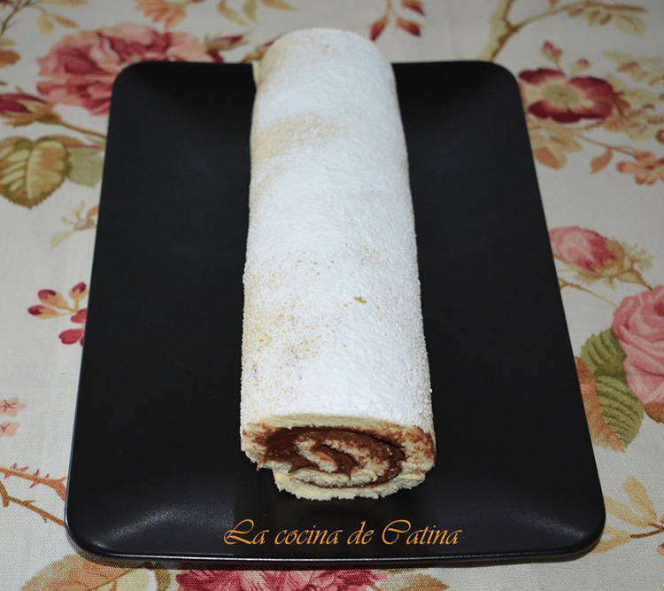 Desenrollamos el bizcocho, lo cubrimos con la crema y volvemos a enrollarlo con cuidado.