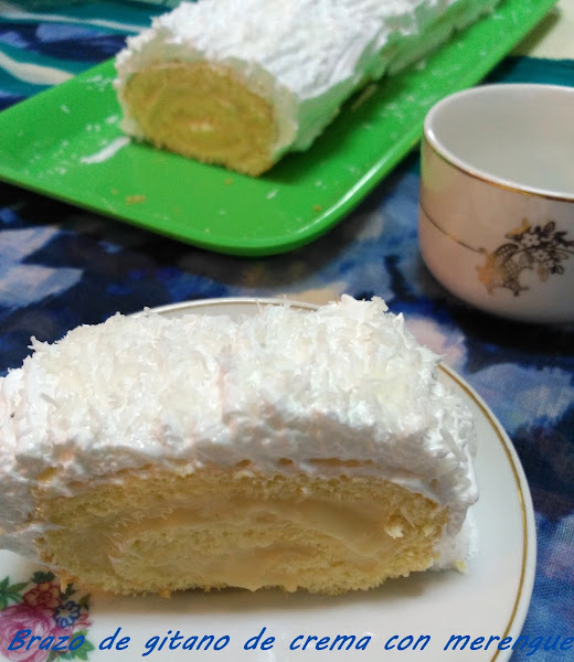 Brazo de gitano de crema con merengue Hoy también hemos apostado por otro postre sencillo,económico y lo que más me gusta a mi con ingredientes de andar por casa.