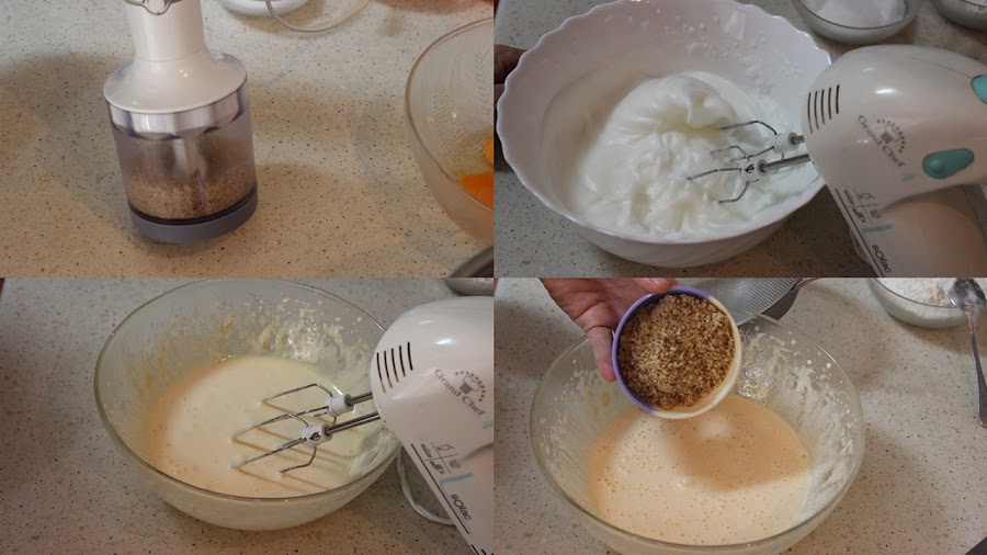 Añadimos a las yemas la harina tamizada junto con la levadura, mezclamos y añadimos las nueces molidas, por último añadimos las claras montadas con movimientos envolventes.