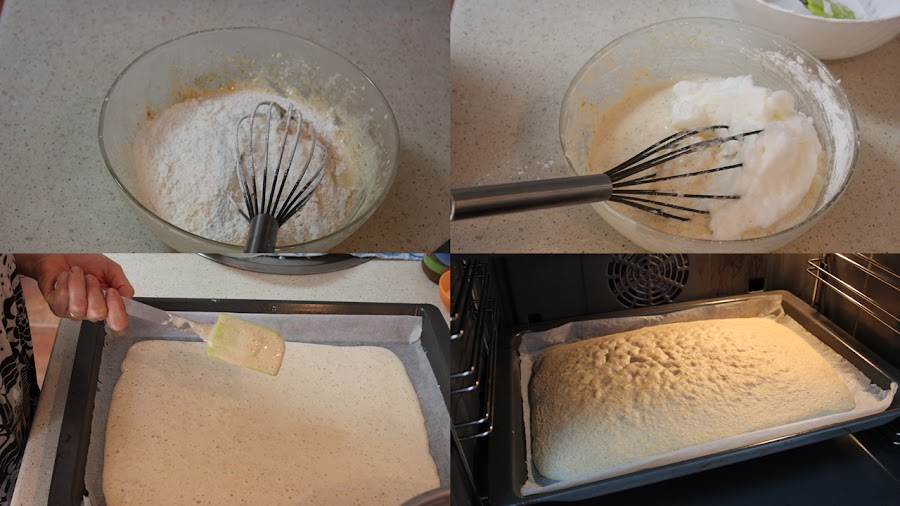 Forramos una bandeja de horno con papel vegetal y volcamos la masa en ella, la extendemos e igualamos bien.